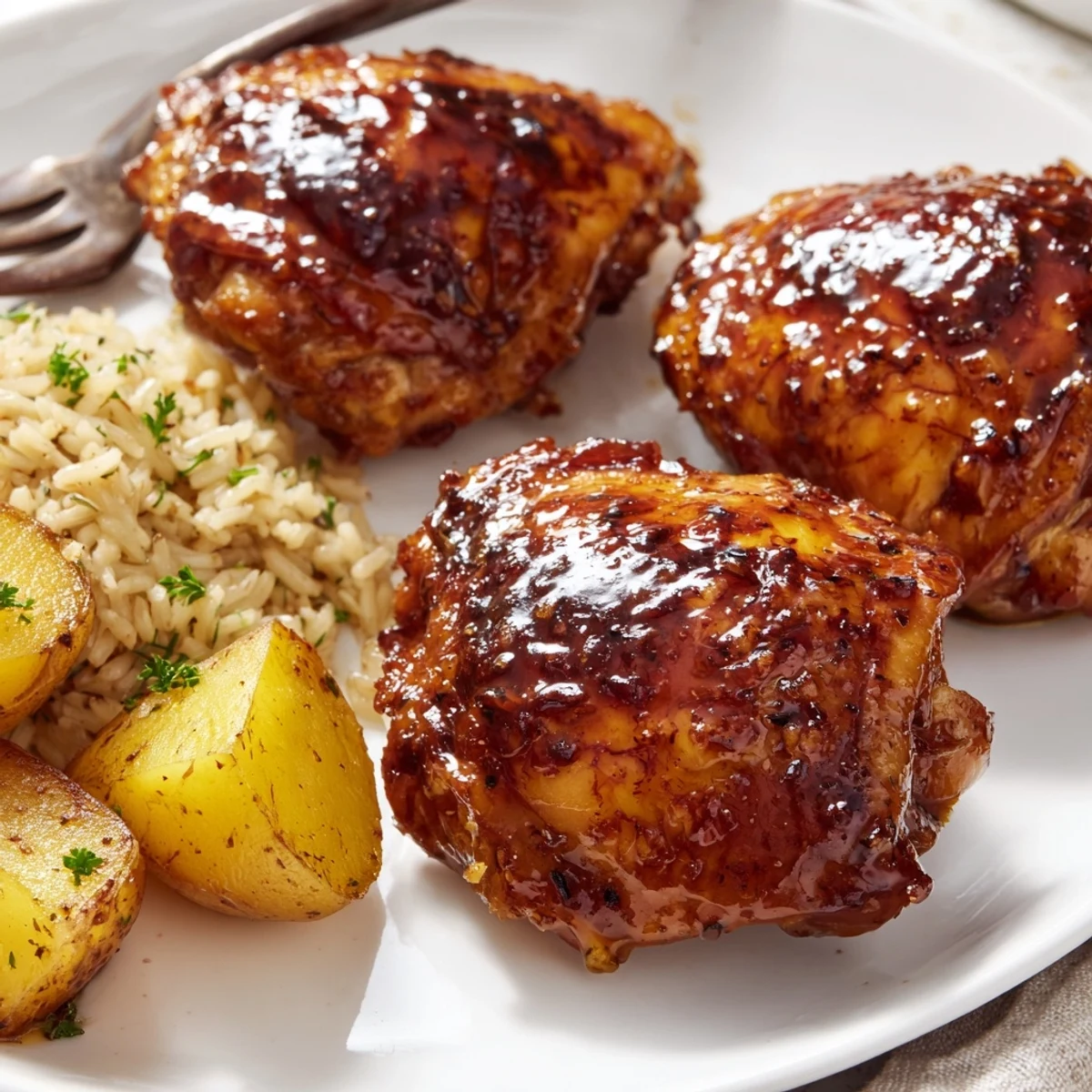 This complete meal features juicy chicken thighs seared then baked with a savory honey-mustard glaze infused with garlic, smoked paprika, and balsamic vinegar. The herb rice is cooked in chicken broth and finished with fresh parsley, dill, and chives for aromatic flavor. Crispy Yukon gold potatoes seasoned with garlic powder and oregano round out this comforting plate. Everything roasts together in the oven while the rice simmers on the stovetop, making this an efficient weeknight dinner that feels special.
